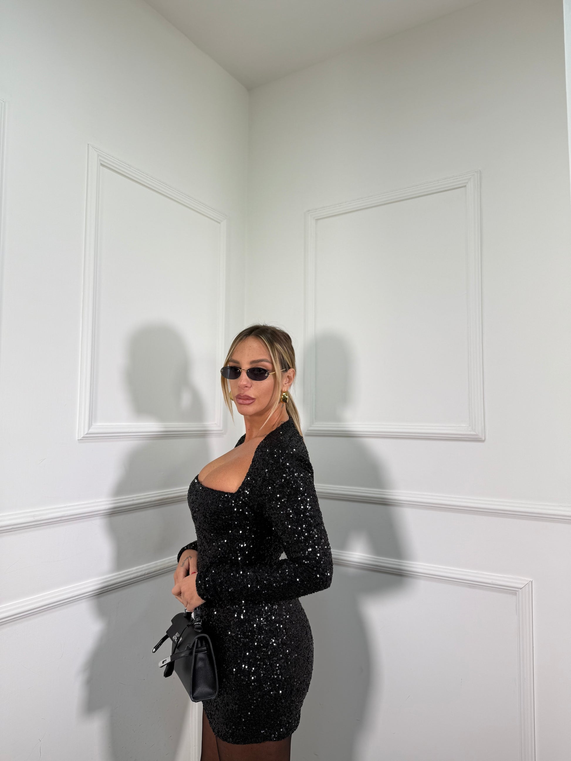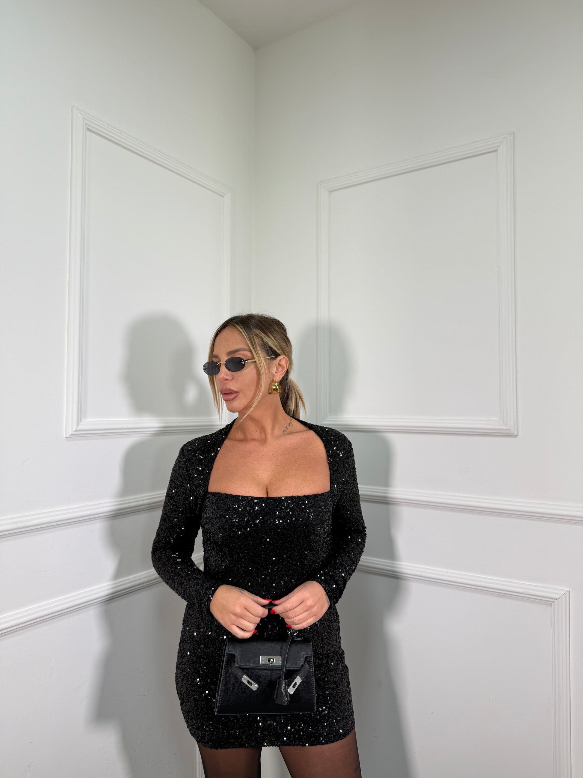 Abito scollo quadrato in micro paillettes Shayla nero 13442