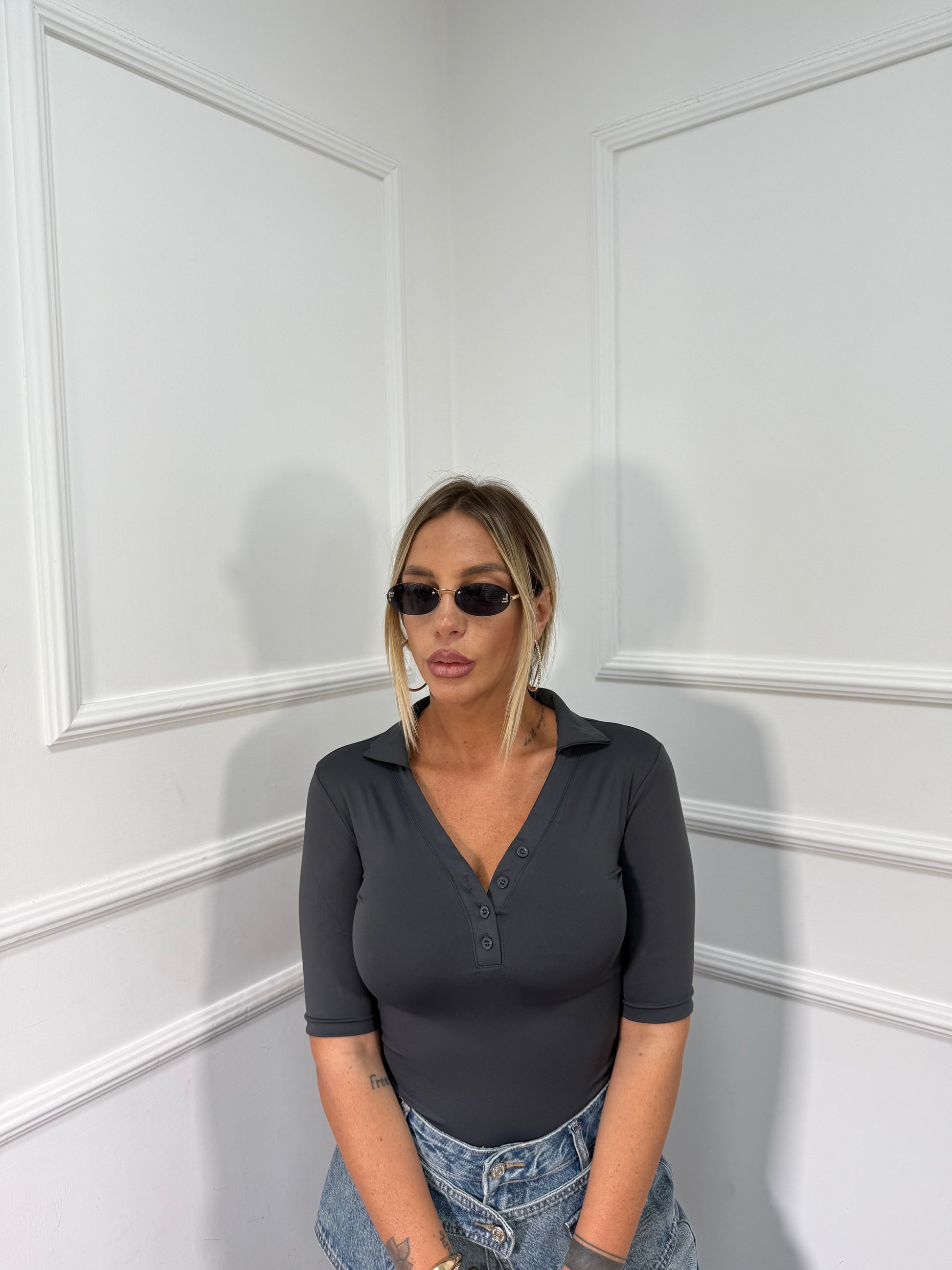 Body polo in lycra con bottoncini grigio antracite rtt59025