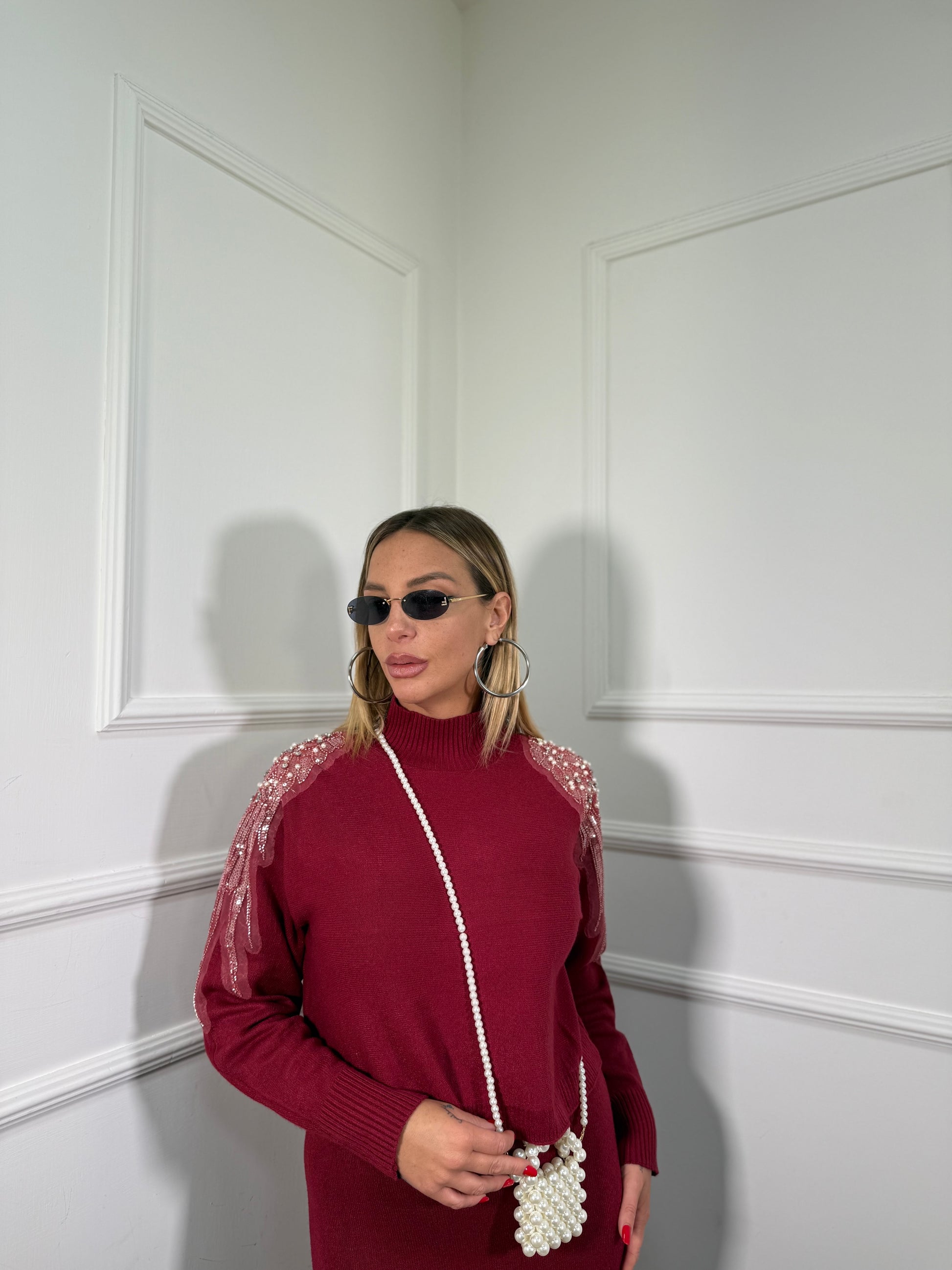 Coordinato midi in lana rasata con Swarovski bordeaux g105