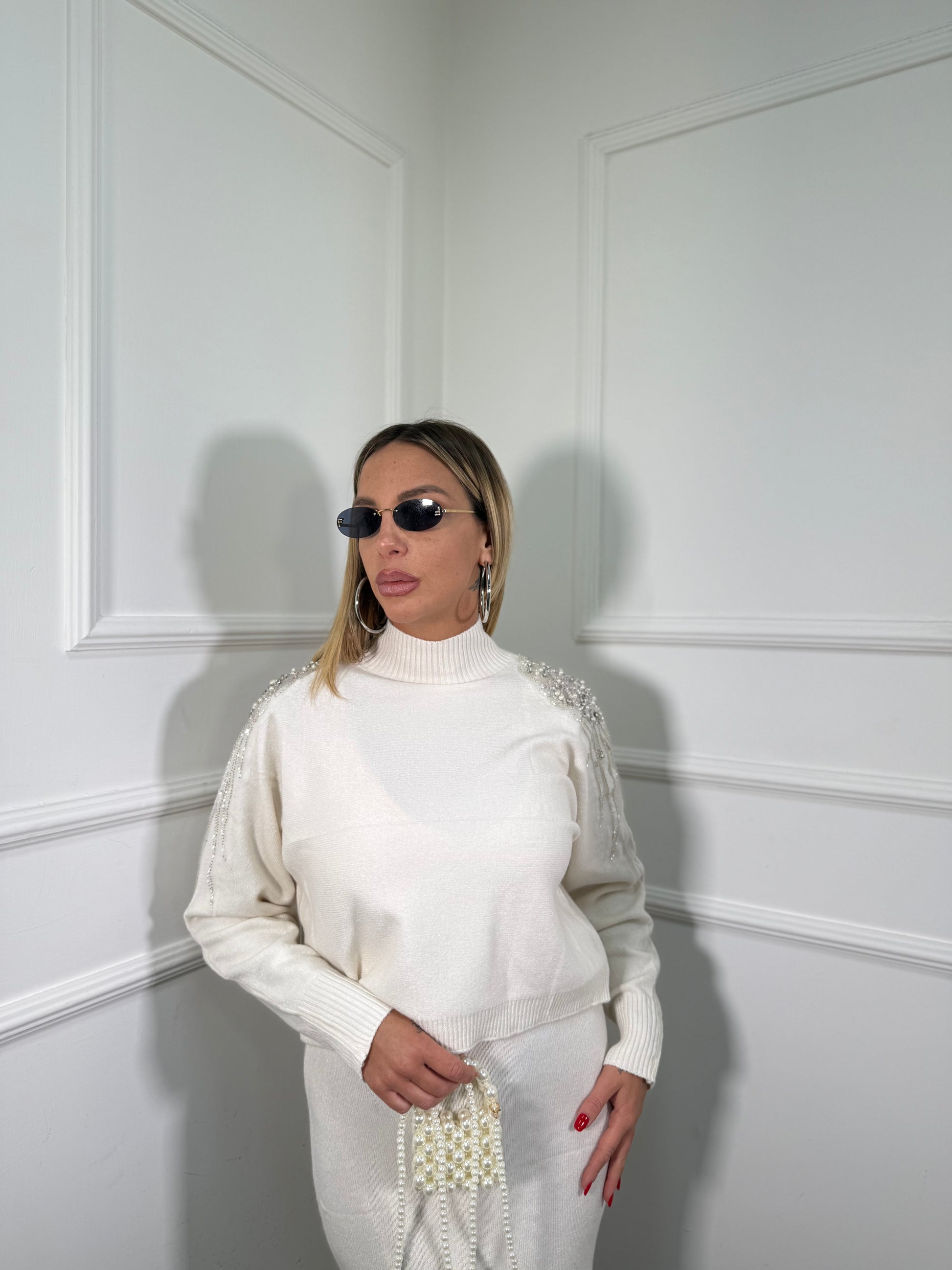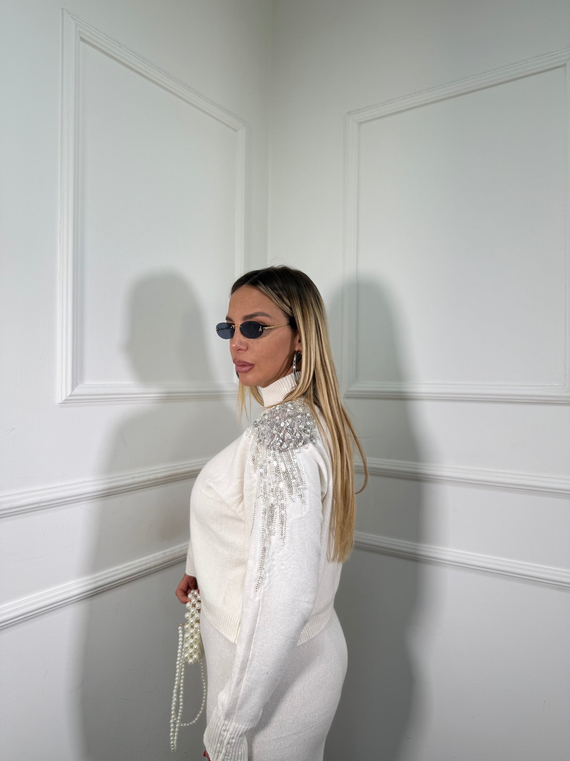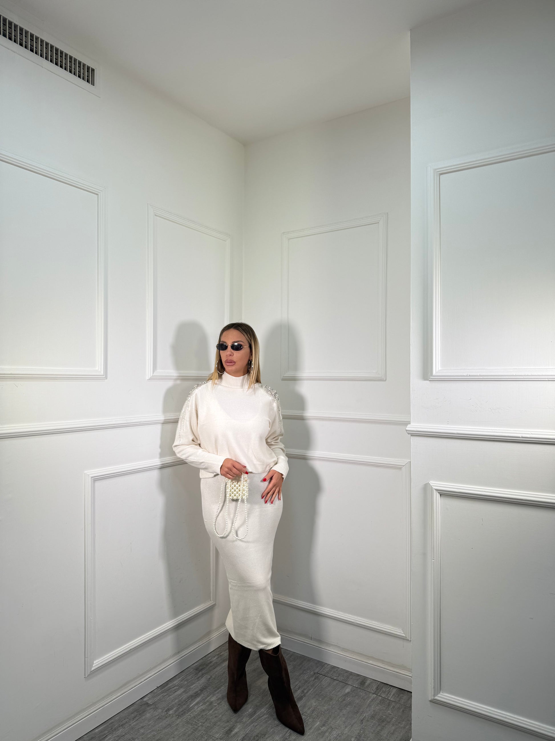 Coordinato midi in lana rasata con Swarovski bianco g105