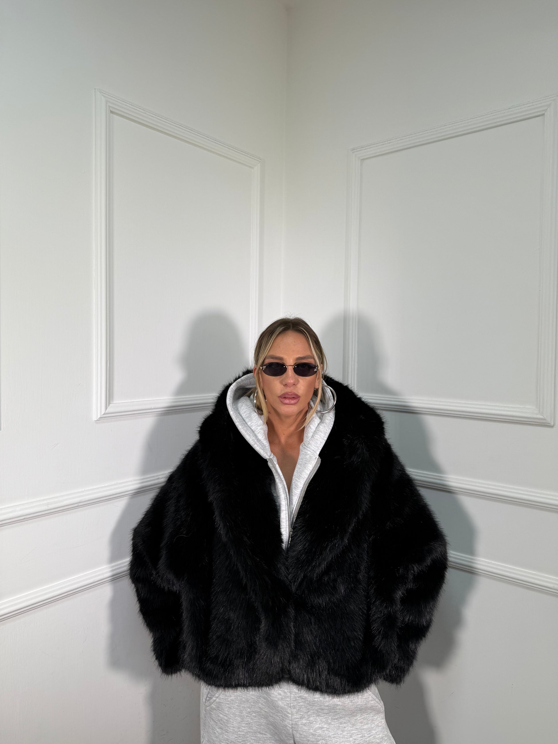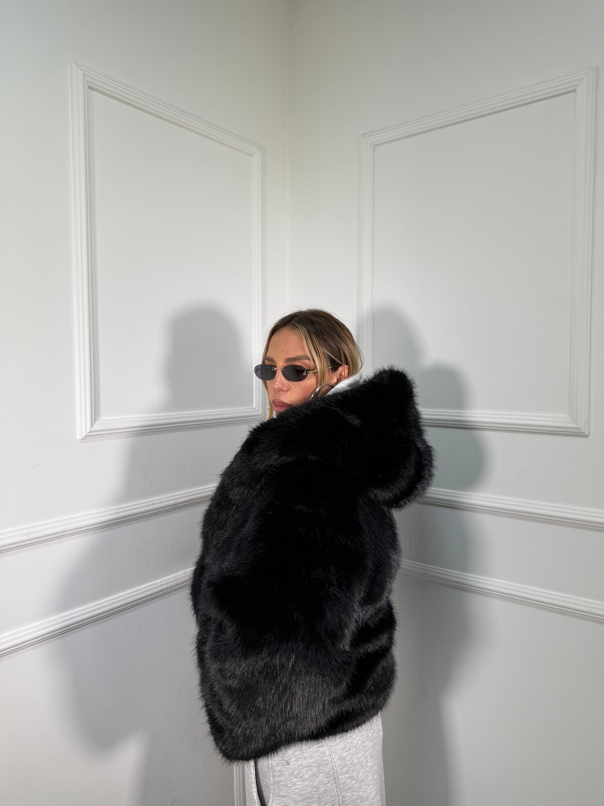 EcoPelliccia modello over con pelo morbido ,gancio da chiusura tasche e cappuccio