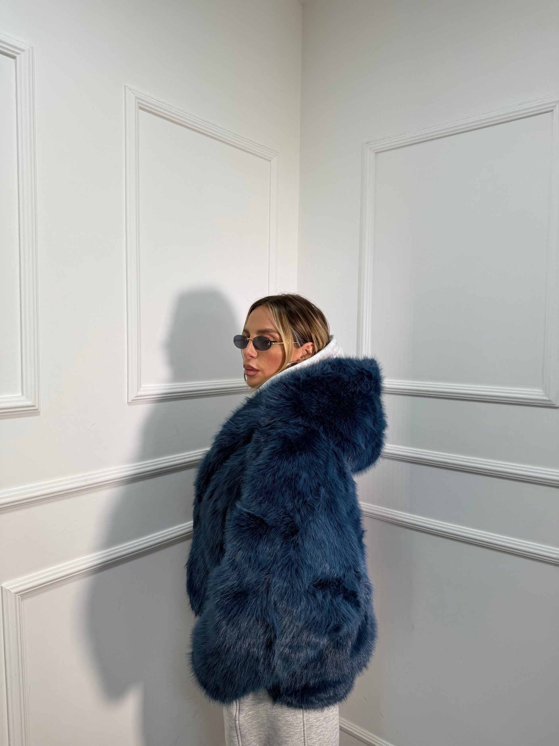 EcoPelliccia modello over con pelo morbido ,gancio da chiusura tasche e cappuccio