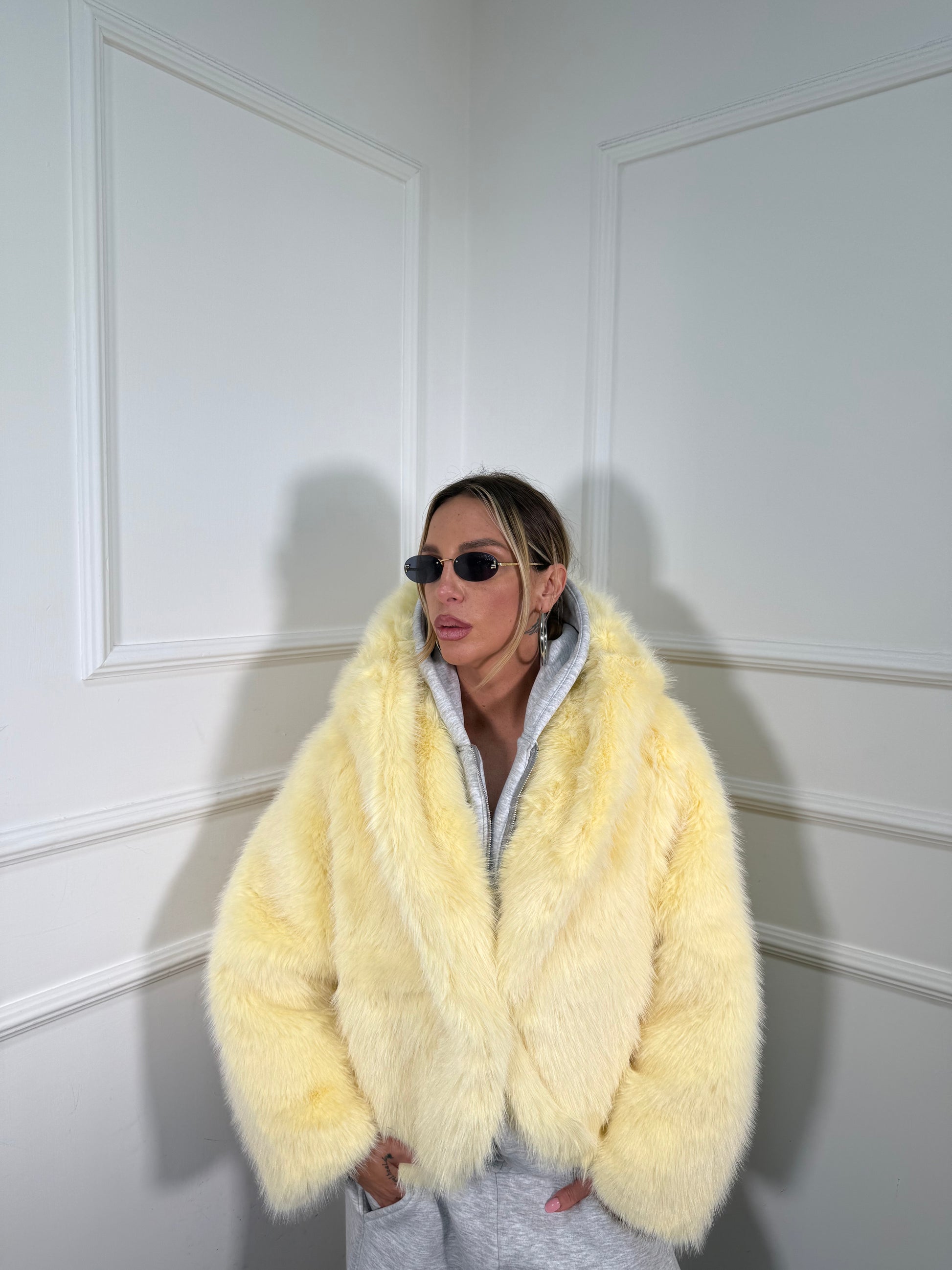 EcoPelliccia modello over con pelo morbido ,gancio da chiusura tasche e cappuccio