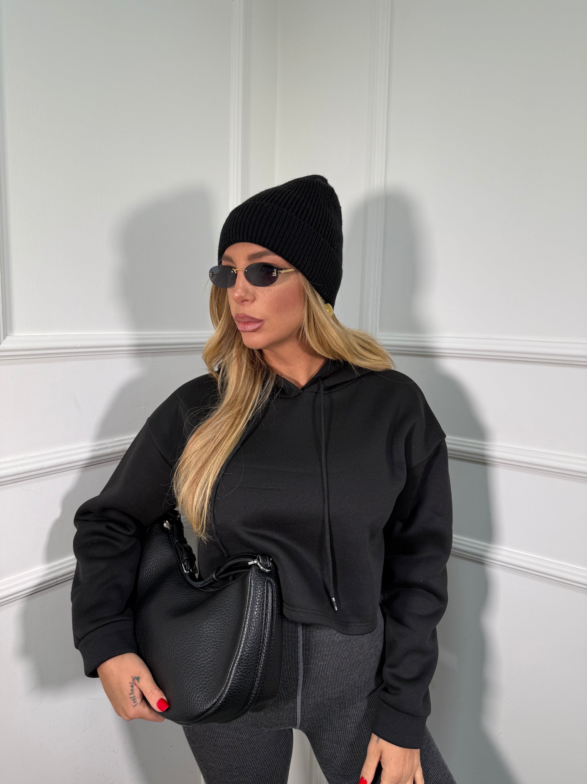 Felpa crop con cappuccio in pile nera