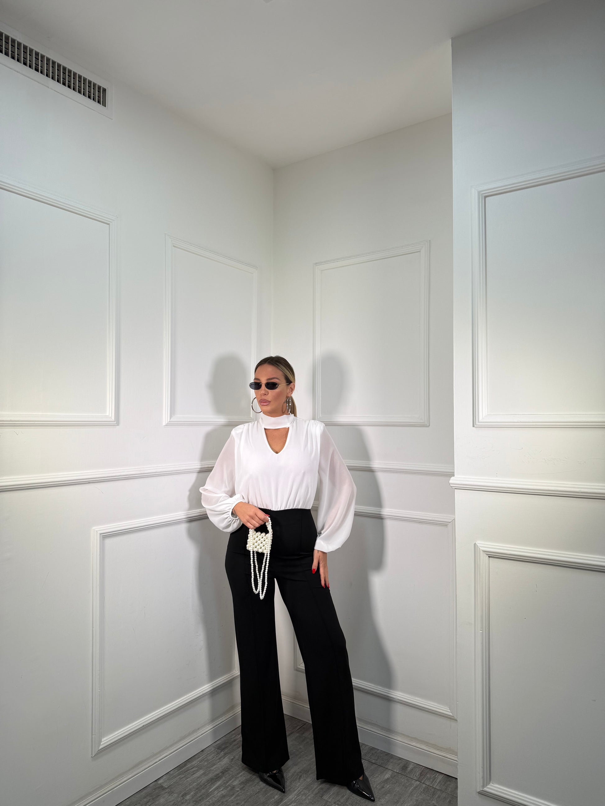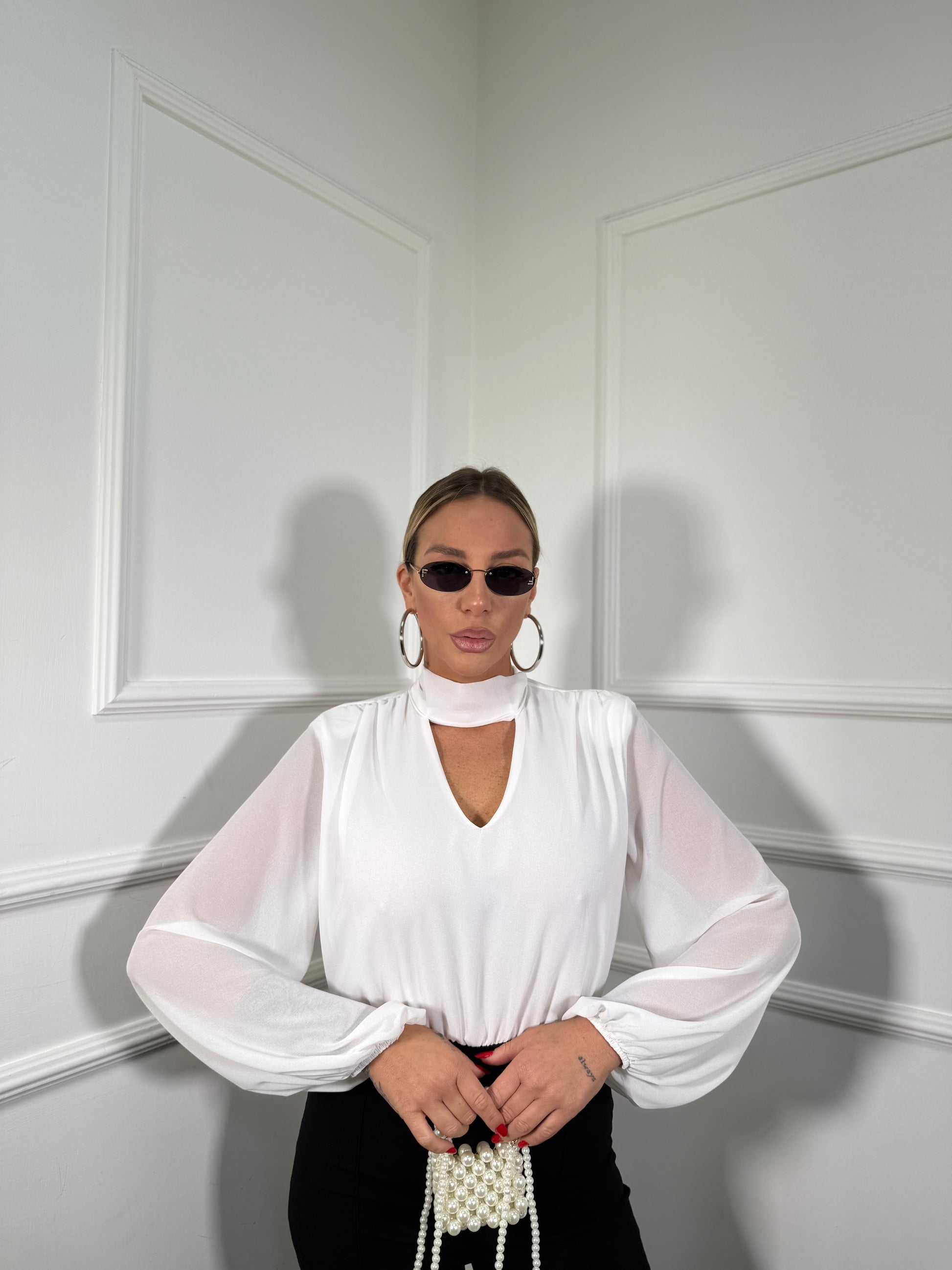 Mezzo collo velata con fiocco regolabile con manica balloon con polsino elastico