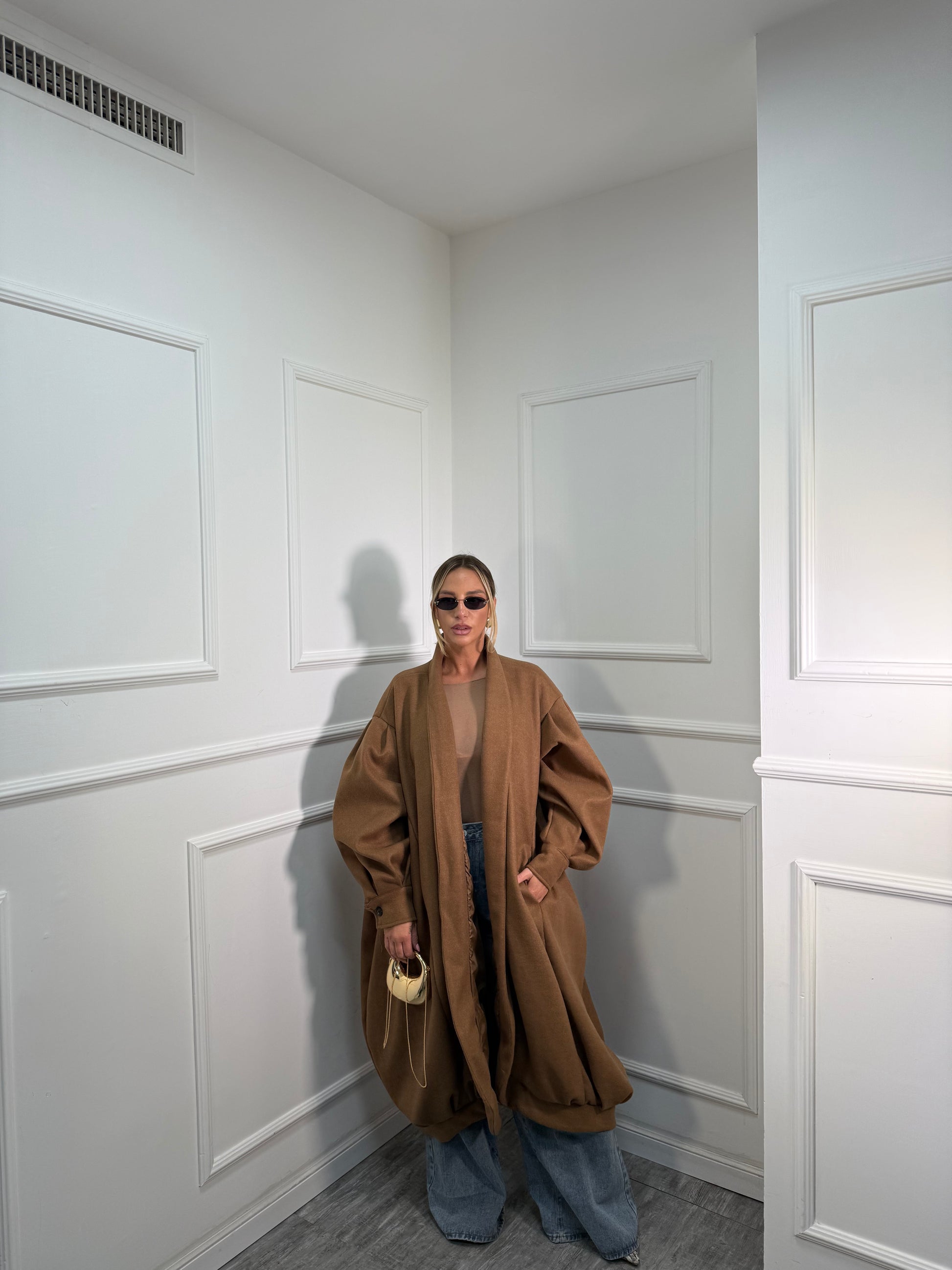 Cappotto over size in panno di lana con manica a sbuffo, tasche a filetto