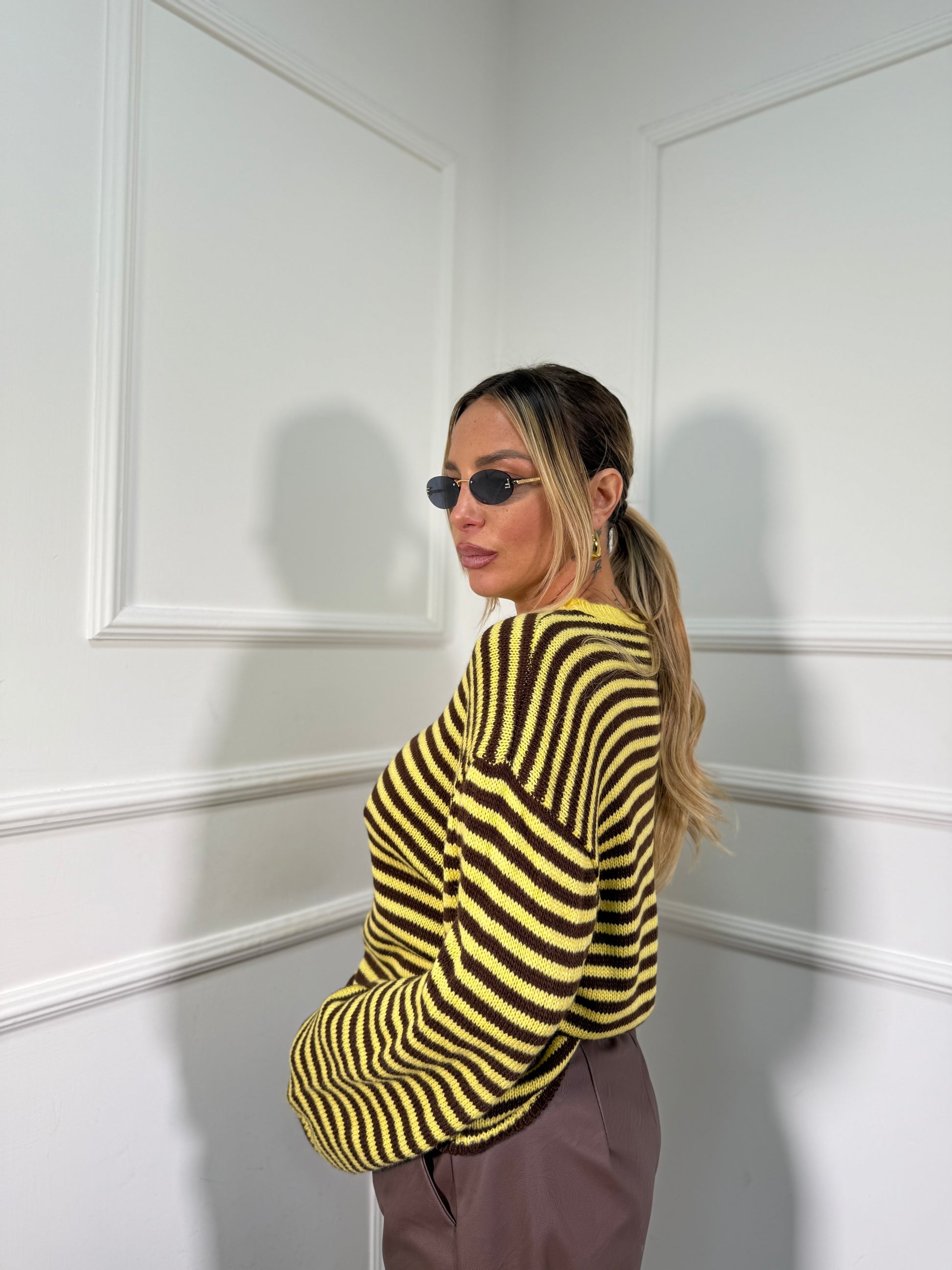 Pullover in maglia a righe manica campana cioccolato/giallo 025835