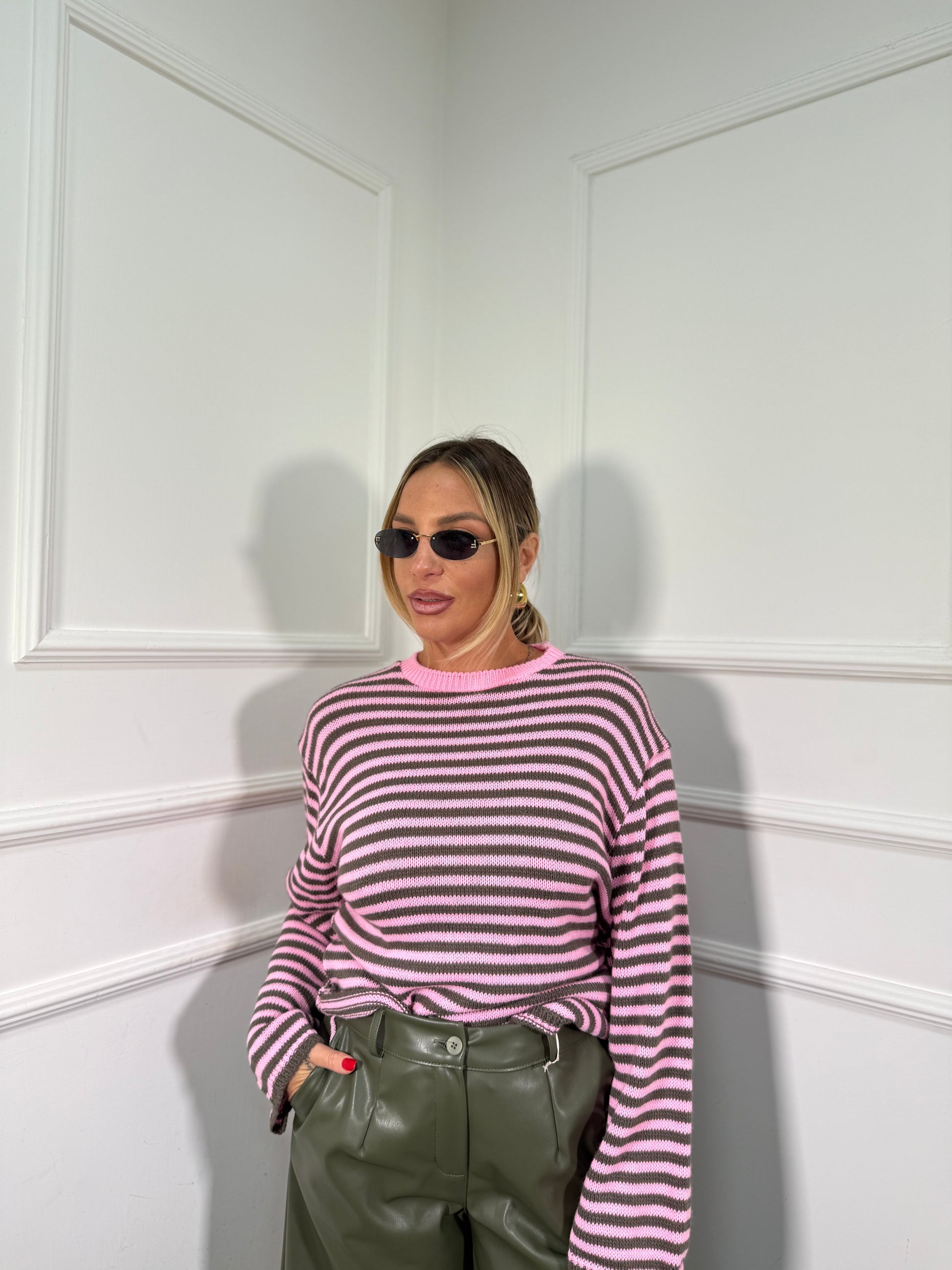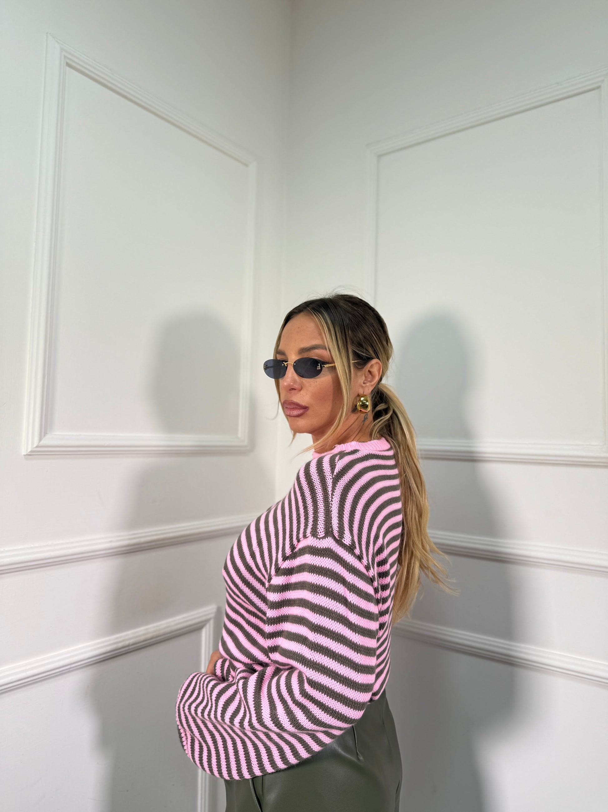 Pullover in maglia a righe manica campana verde/rosa 025835