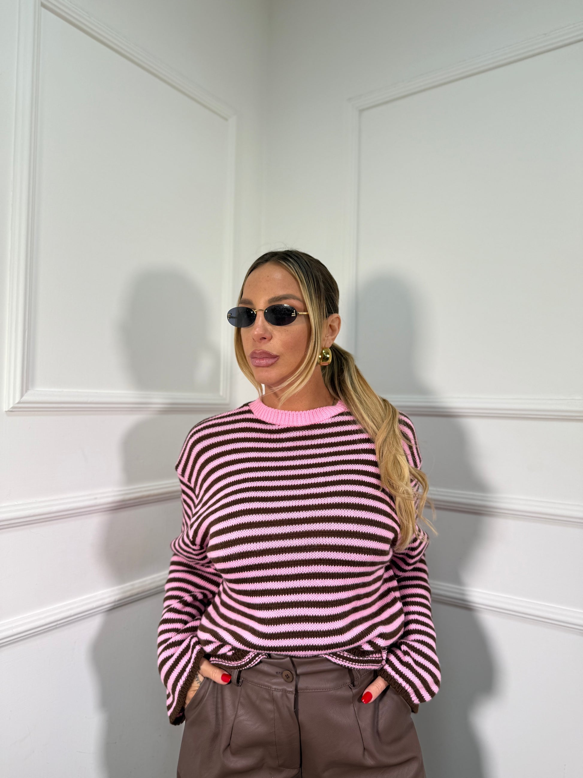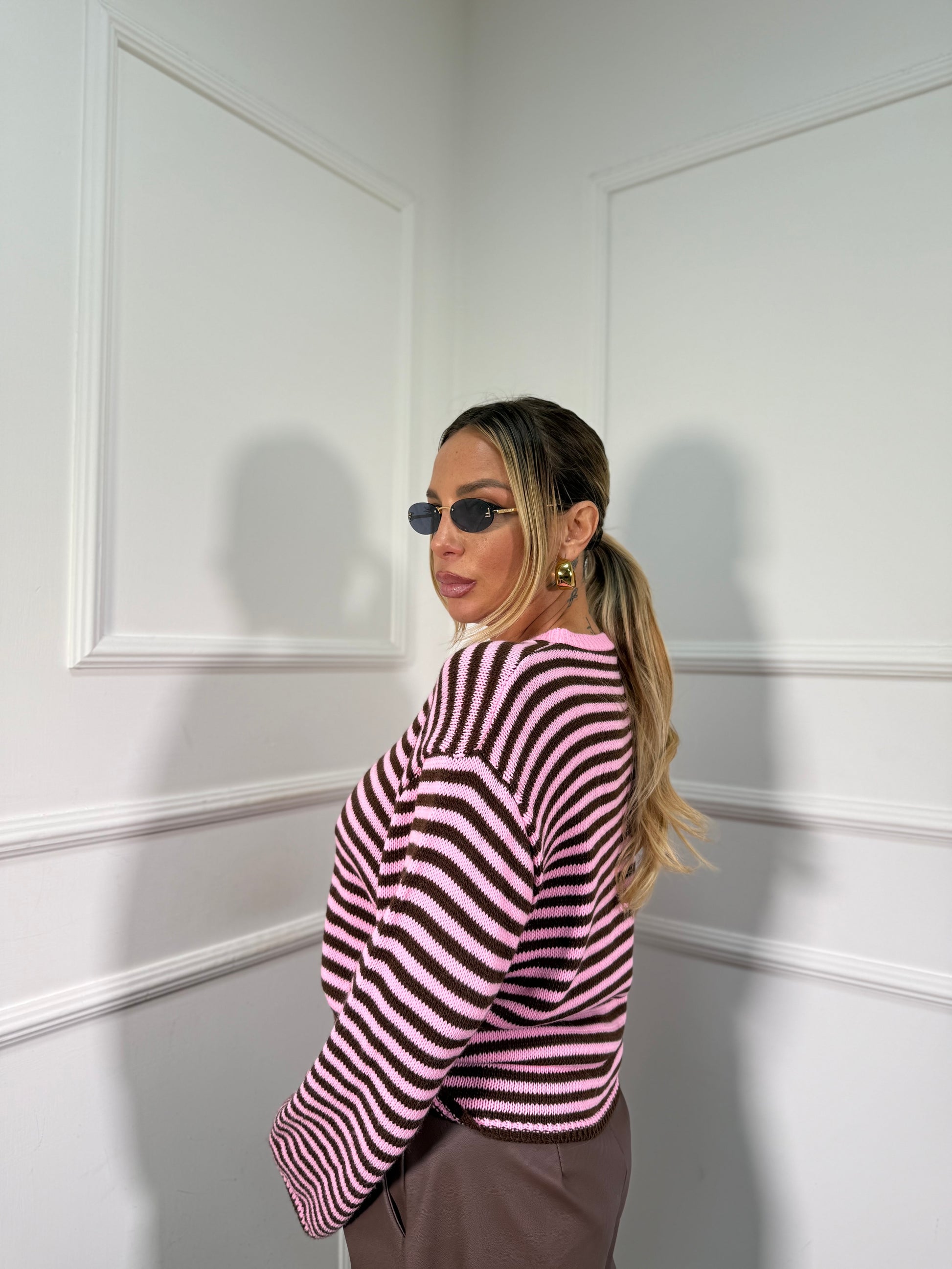 Pullover in maglia a righe manica campana rosa/cioccolato 025835