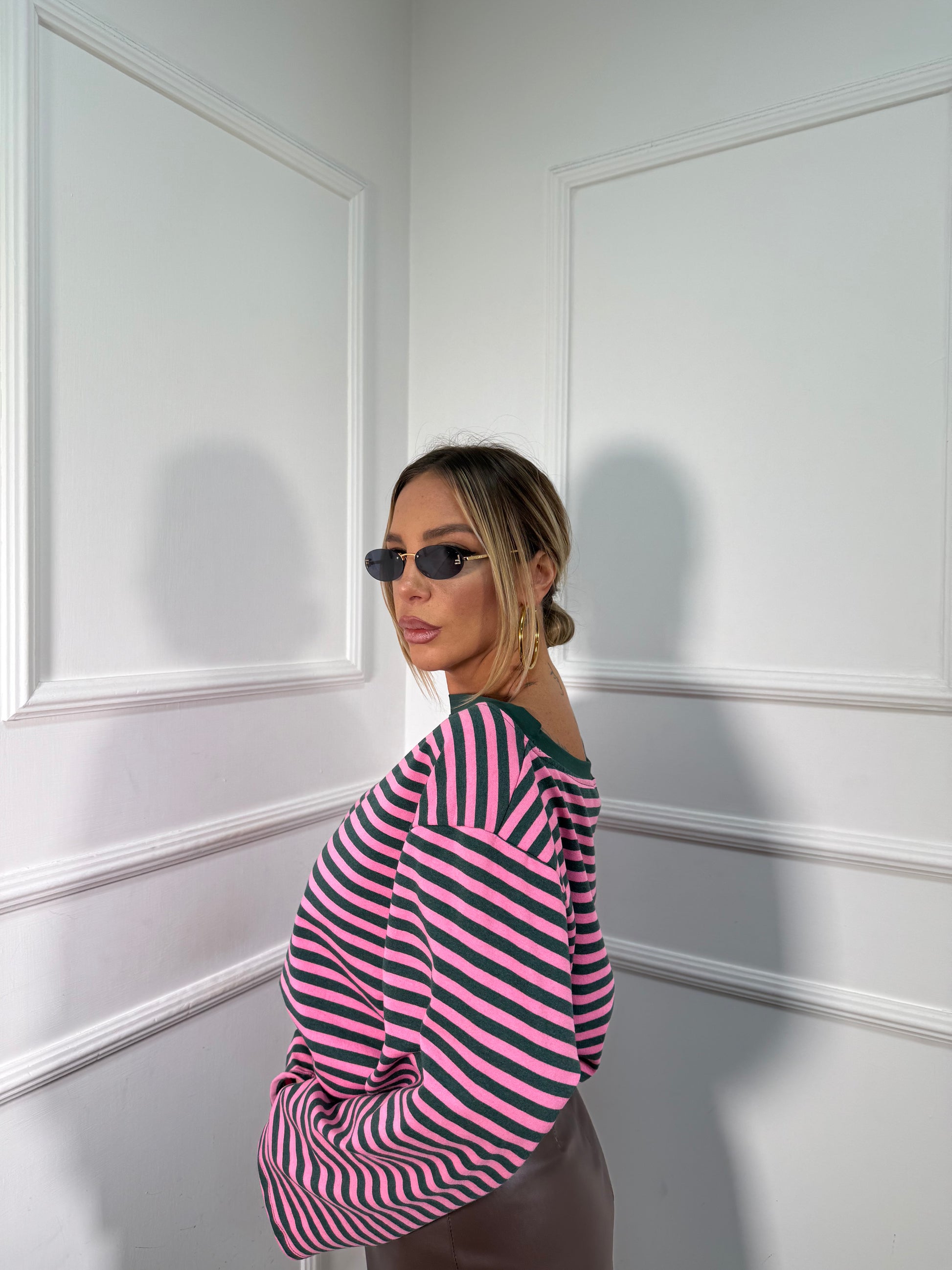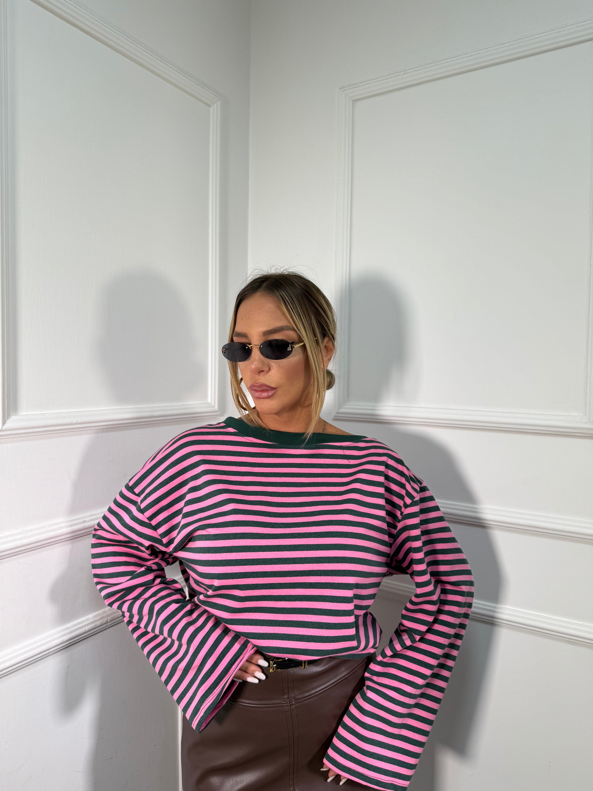 Shirt in cotone garzato manica campana Cindy verde/rosa f1109