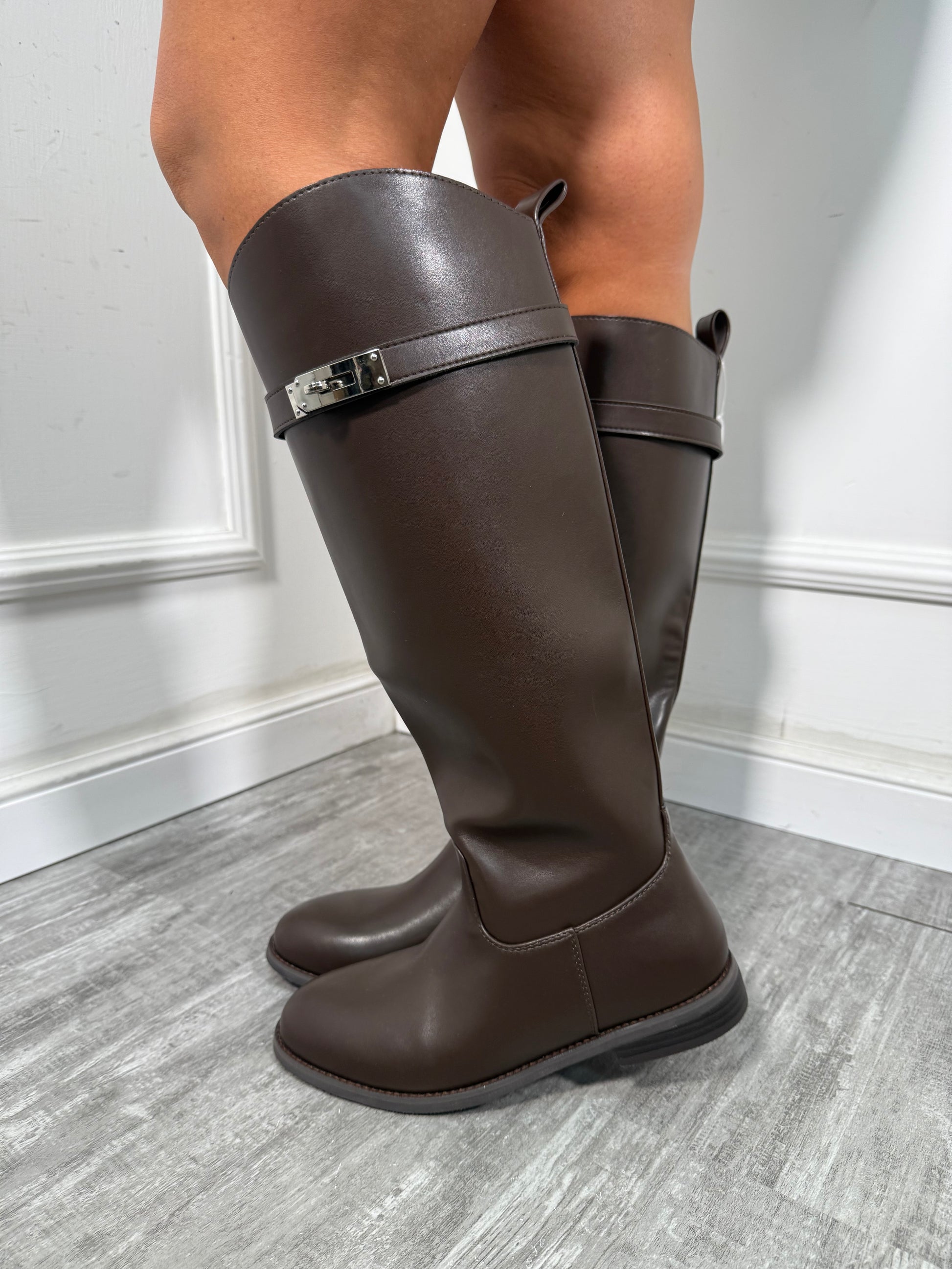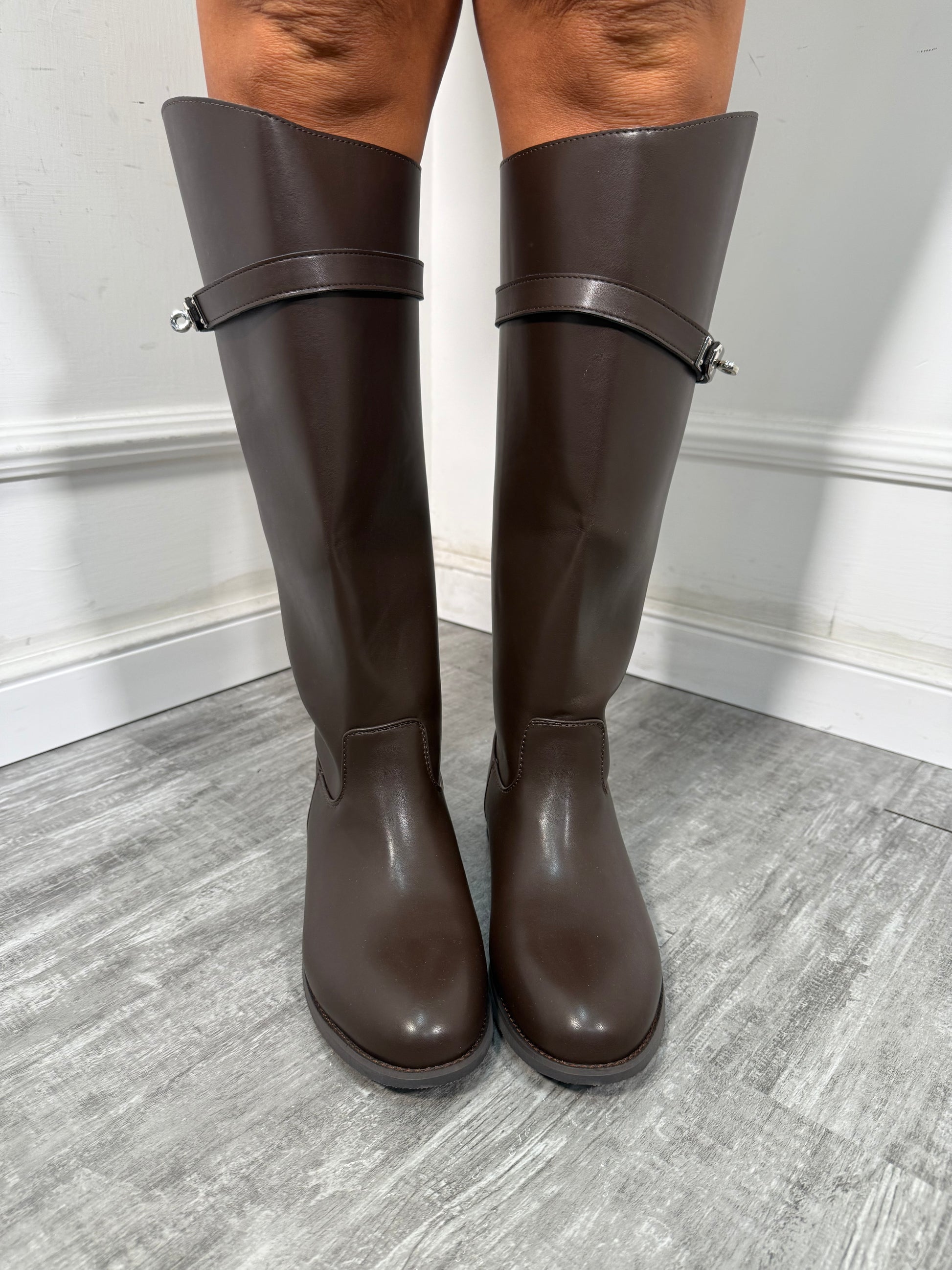 Stivali in ecopelle gambale alto con fibbia cioccolato LA026
