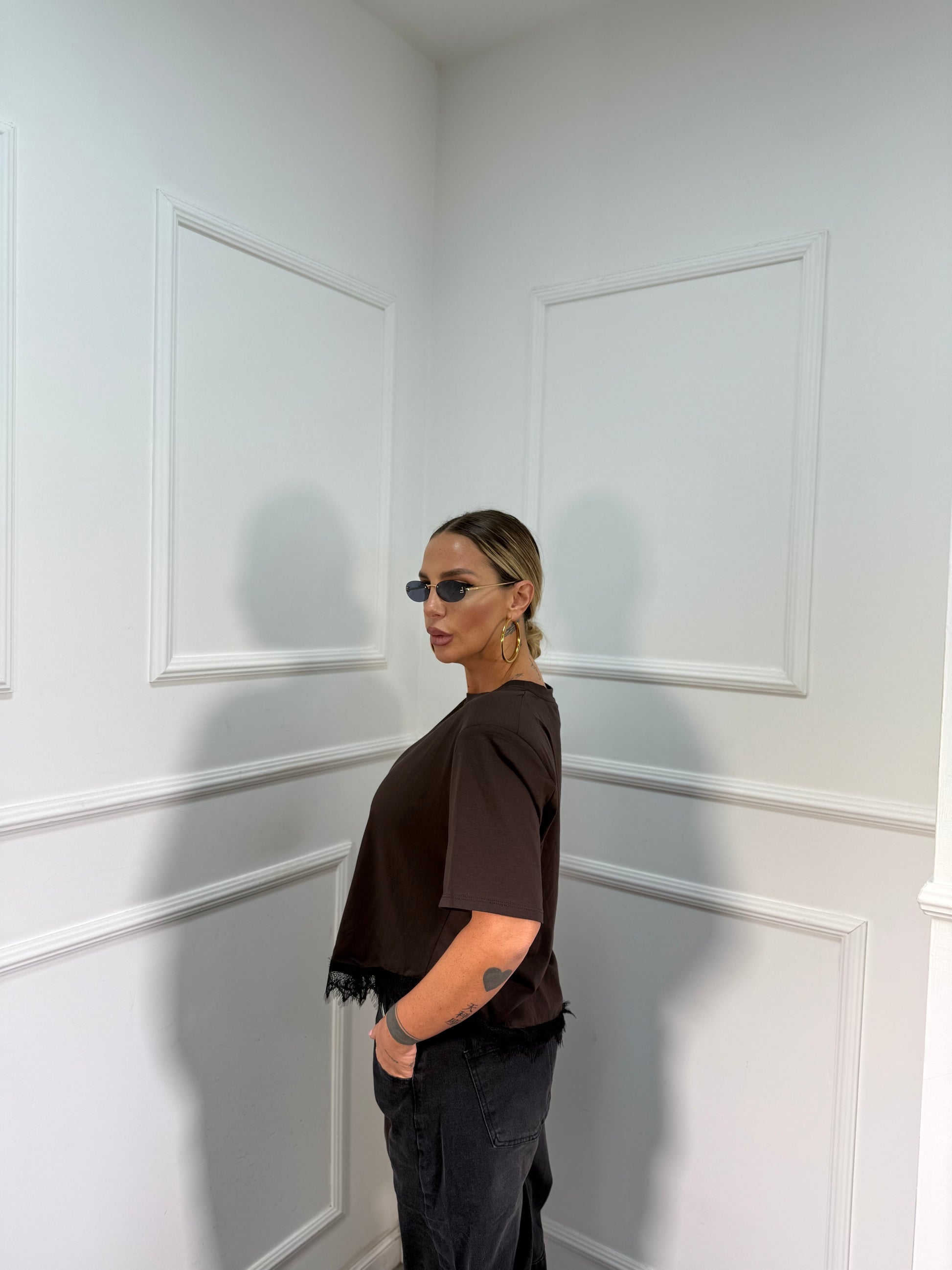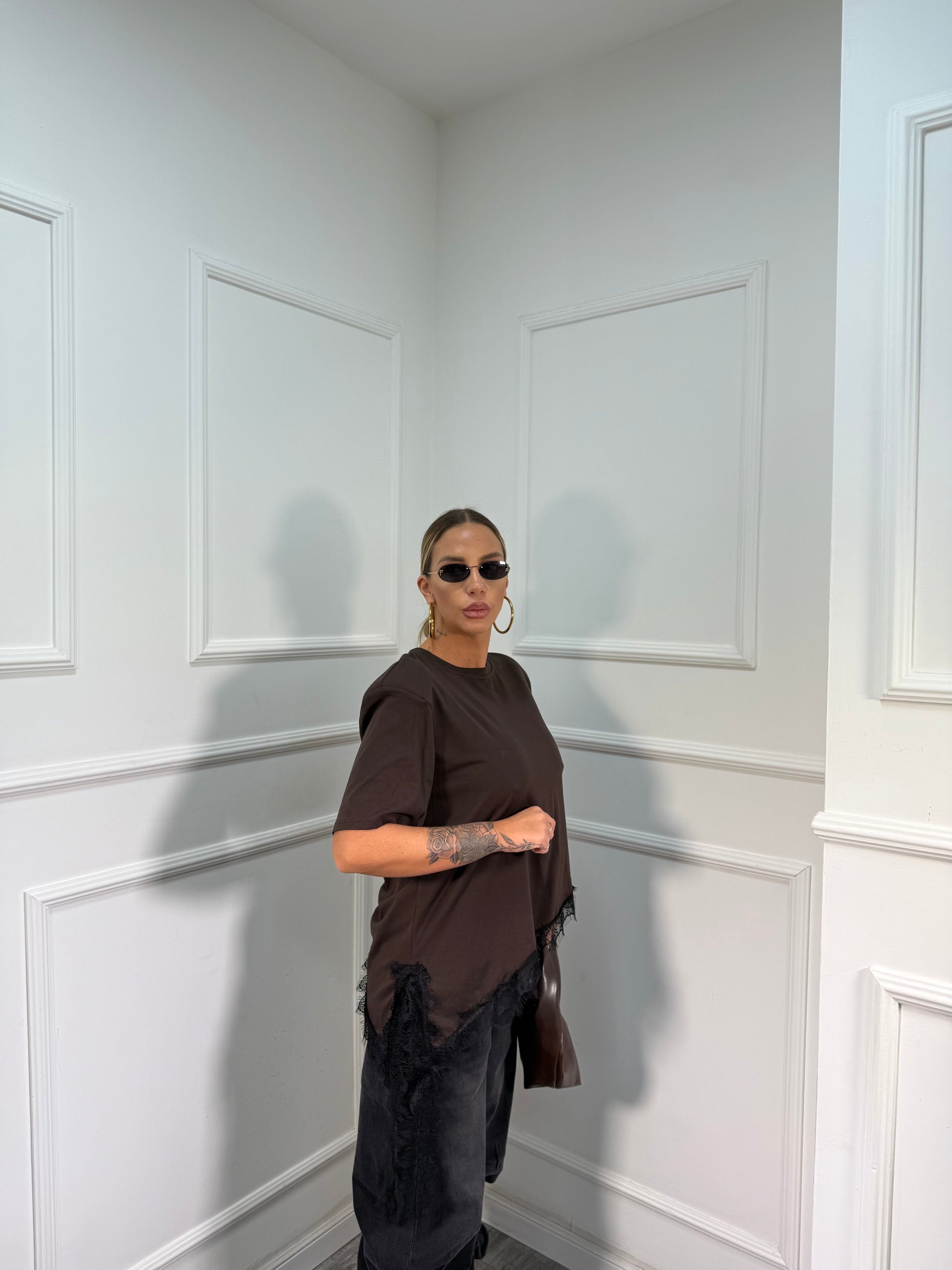 T-shirt asimmetrica con spalline in pizzo marrone m30378