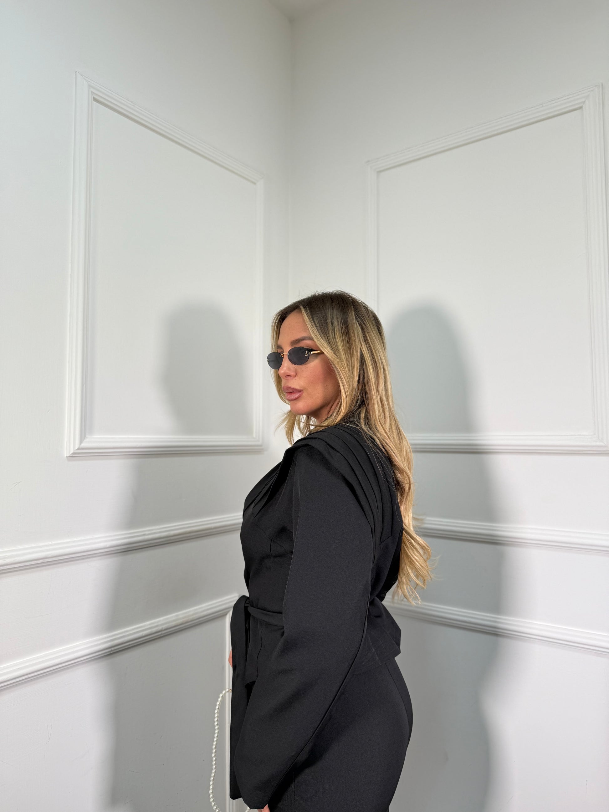 Tailleur composto da blazer crop con spallina strutturata chiusura asimmetrica con fusciacca in vita