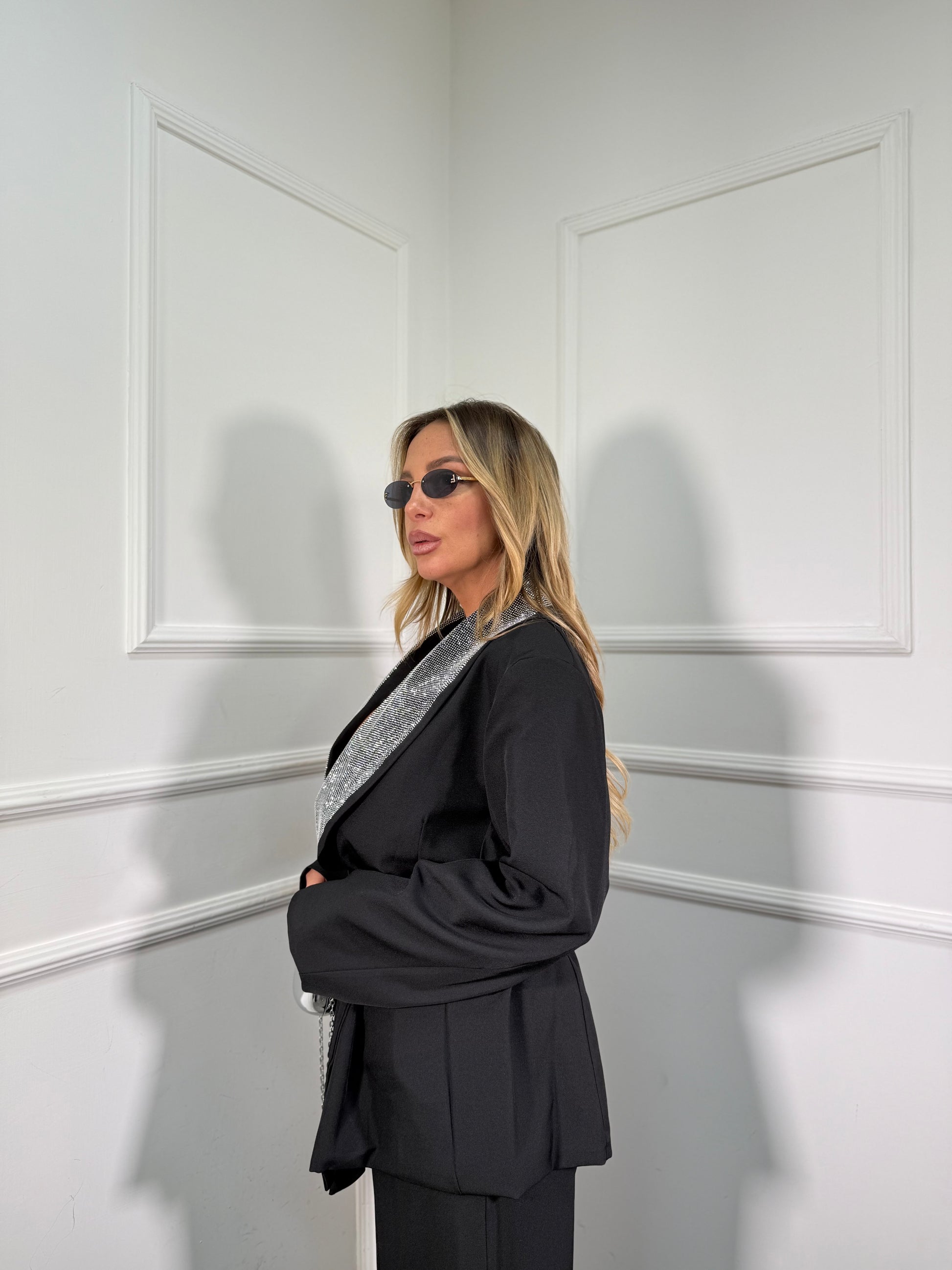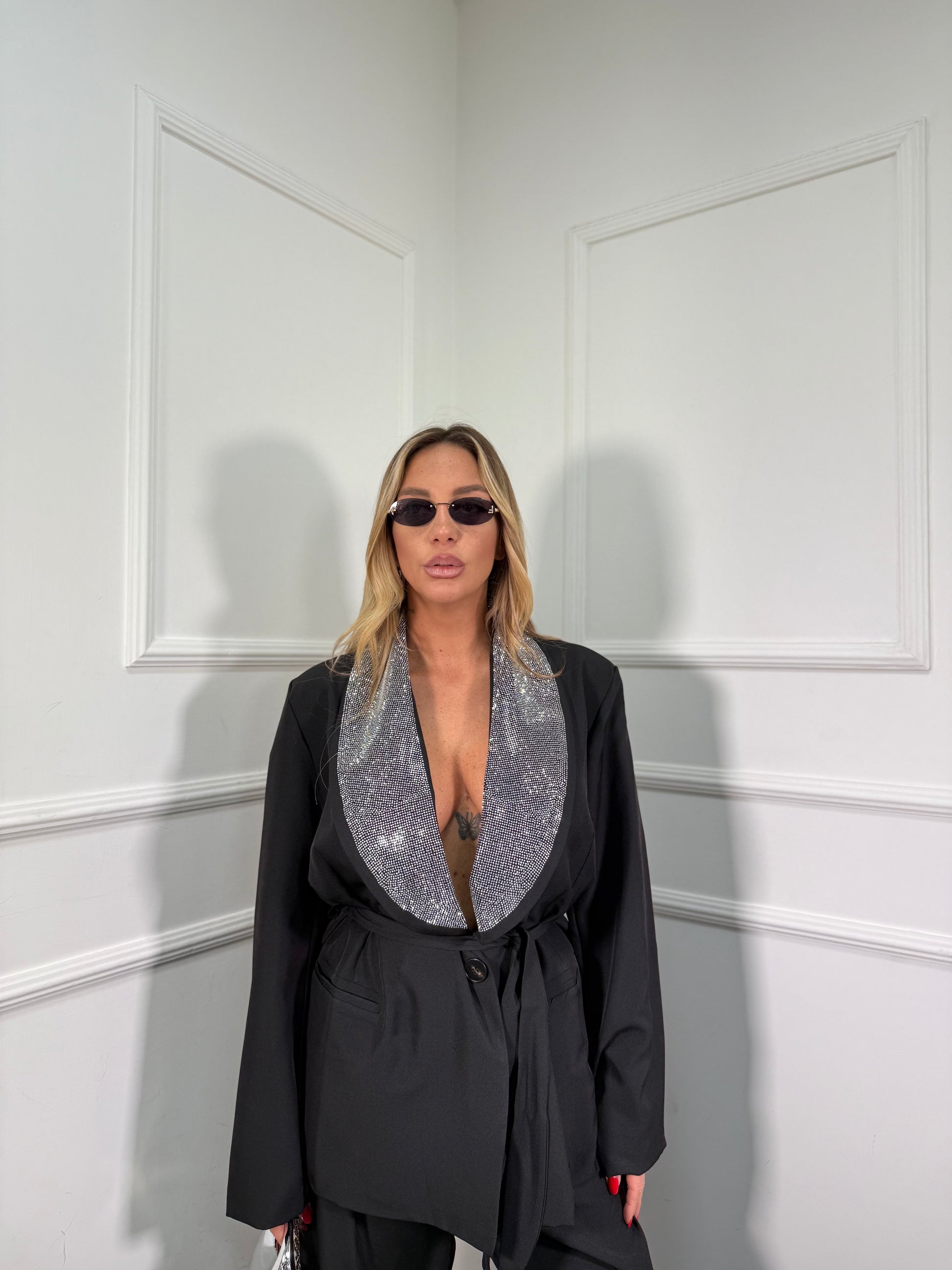 Tailleur composta da giacca con bavero in micro strass e fusciacca in vita