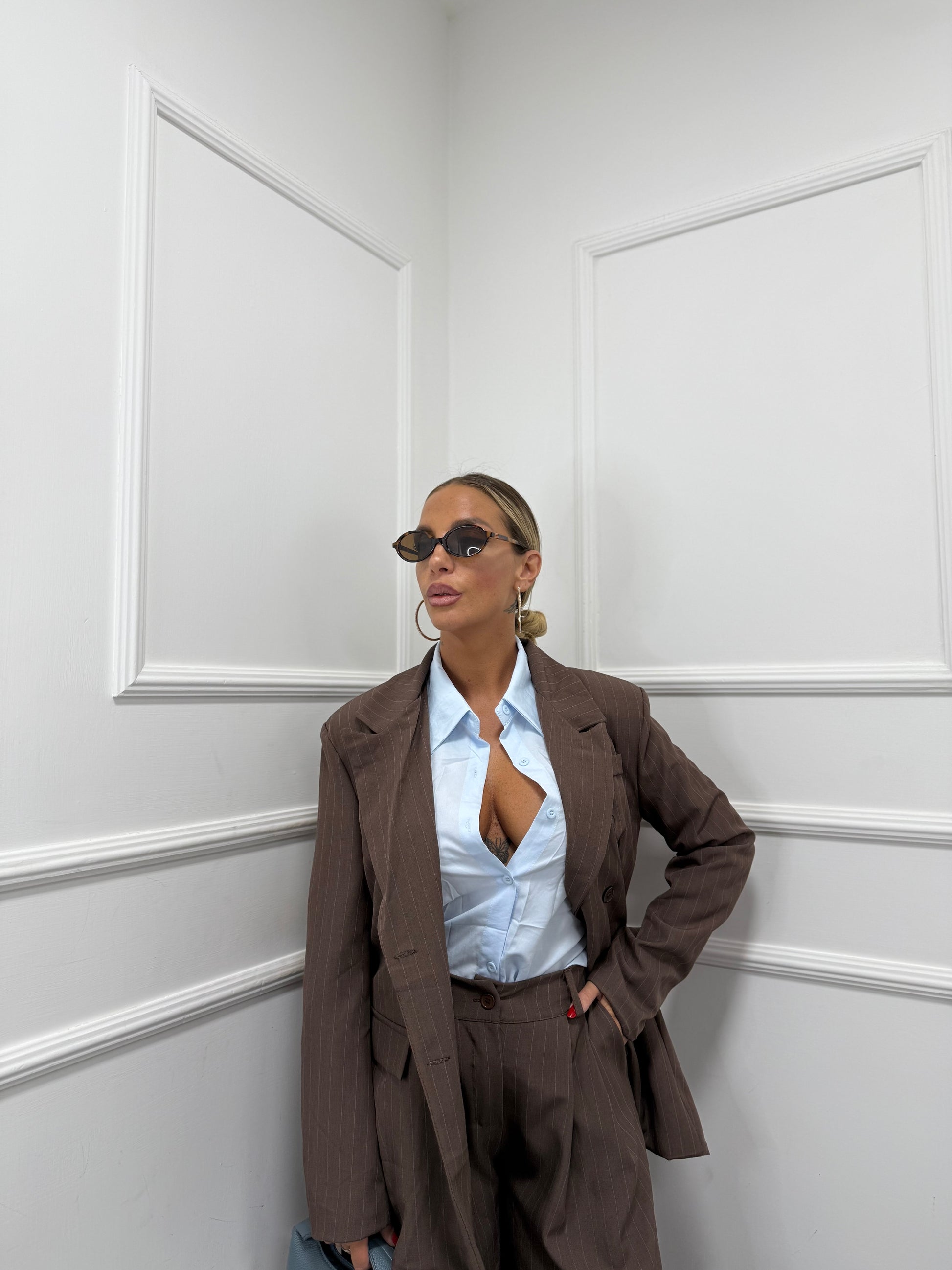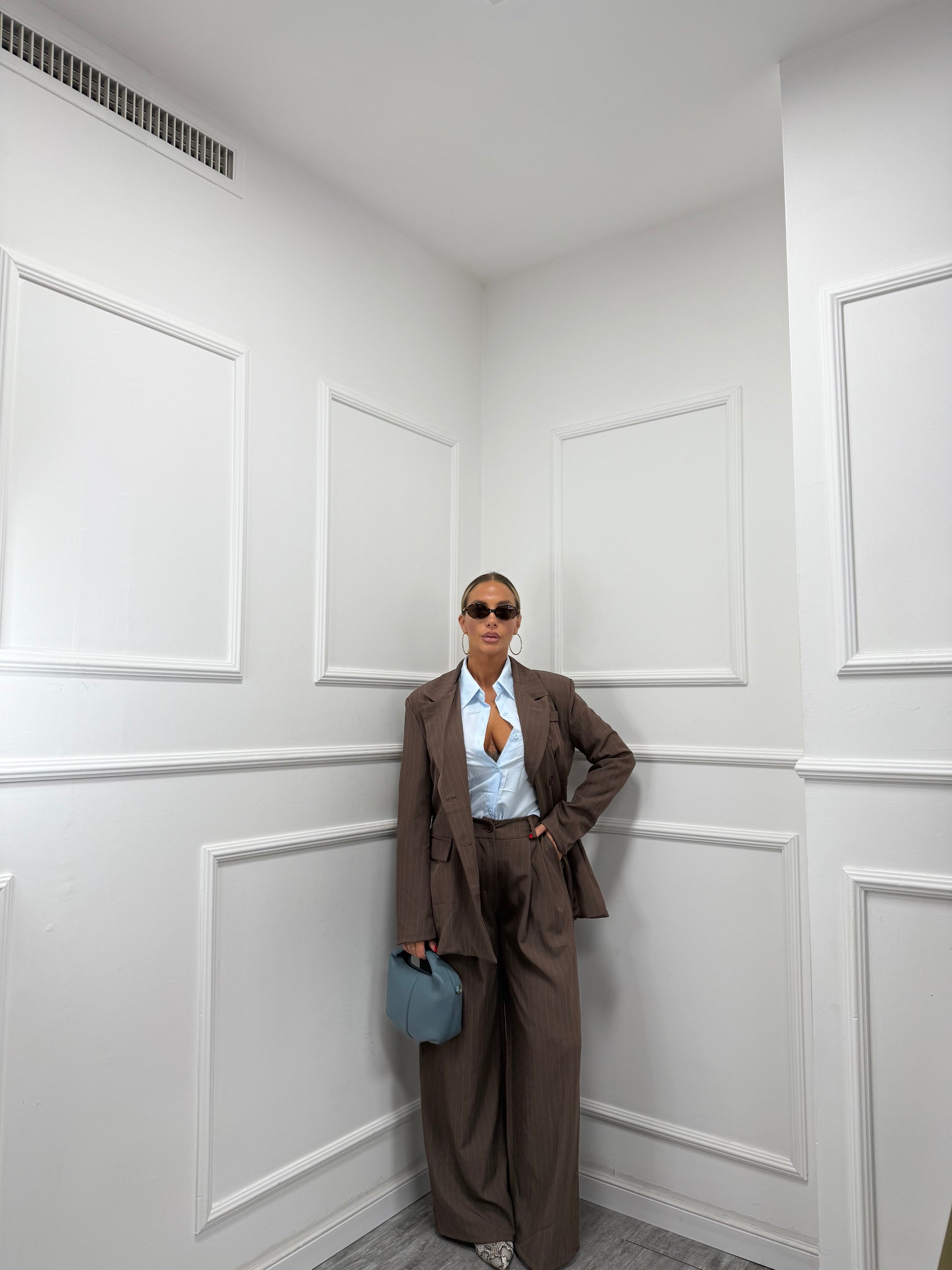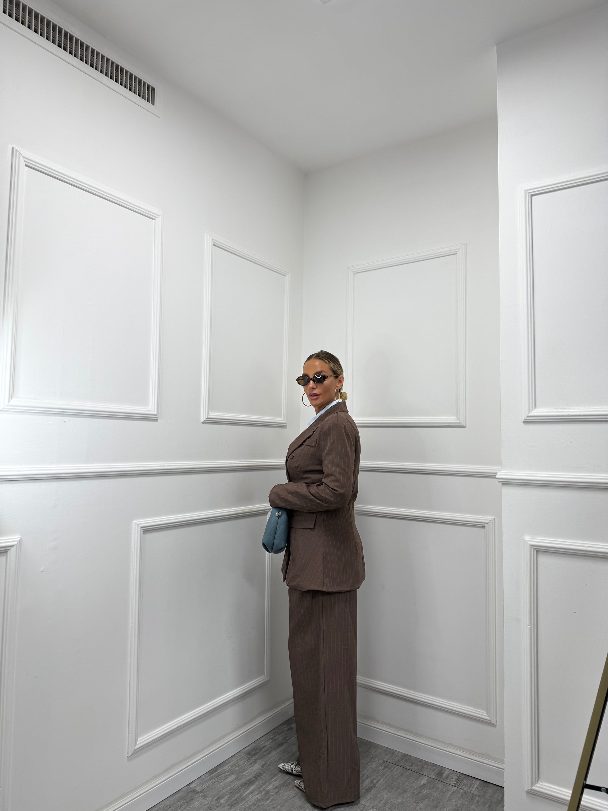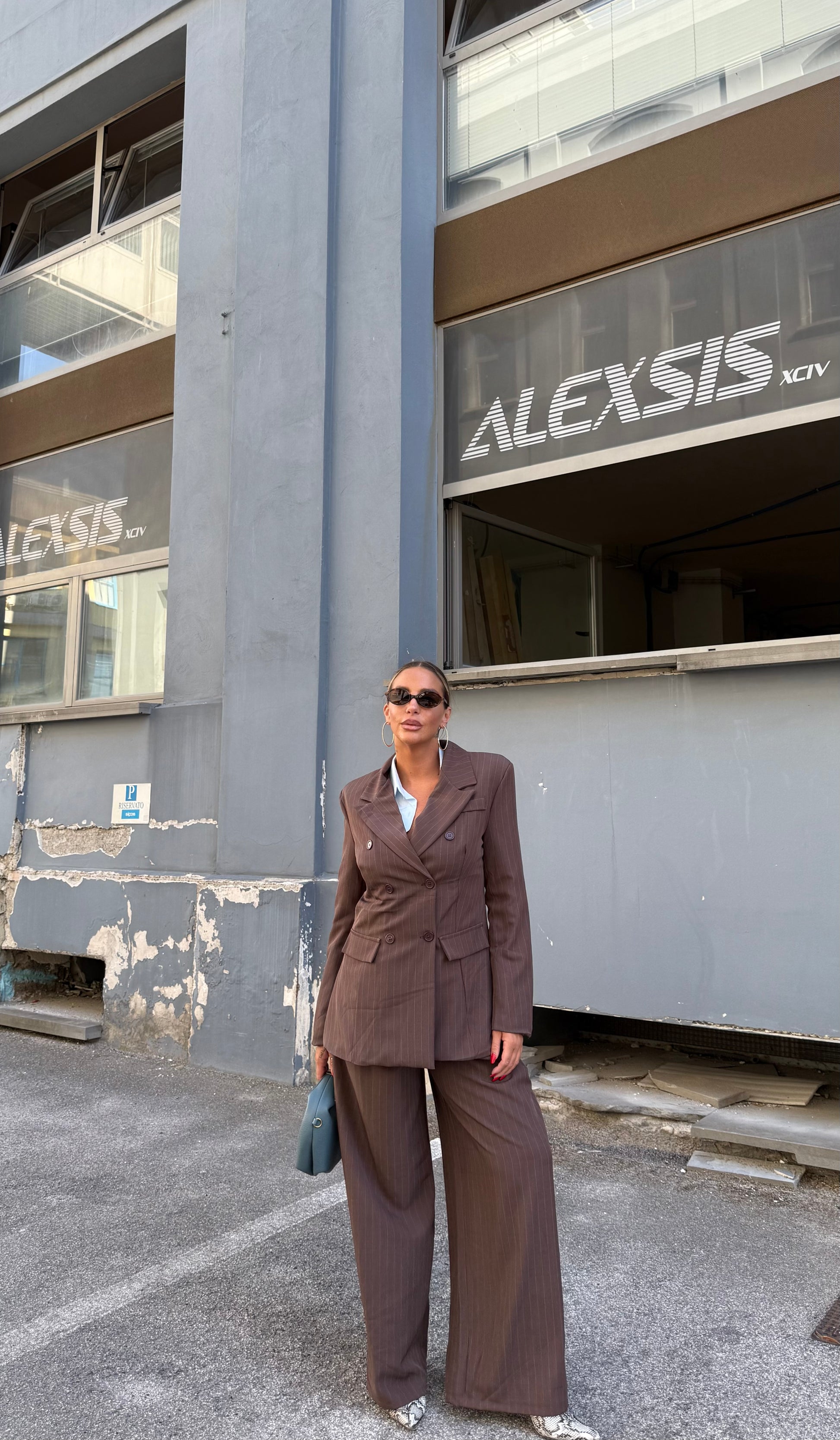 Tailleur composto da giacca doppio petto con spalline imbottite e pantaloni palazzo con elastico sul retro