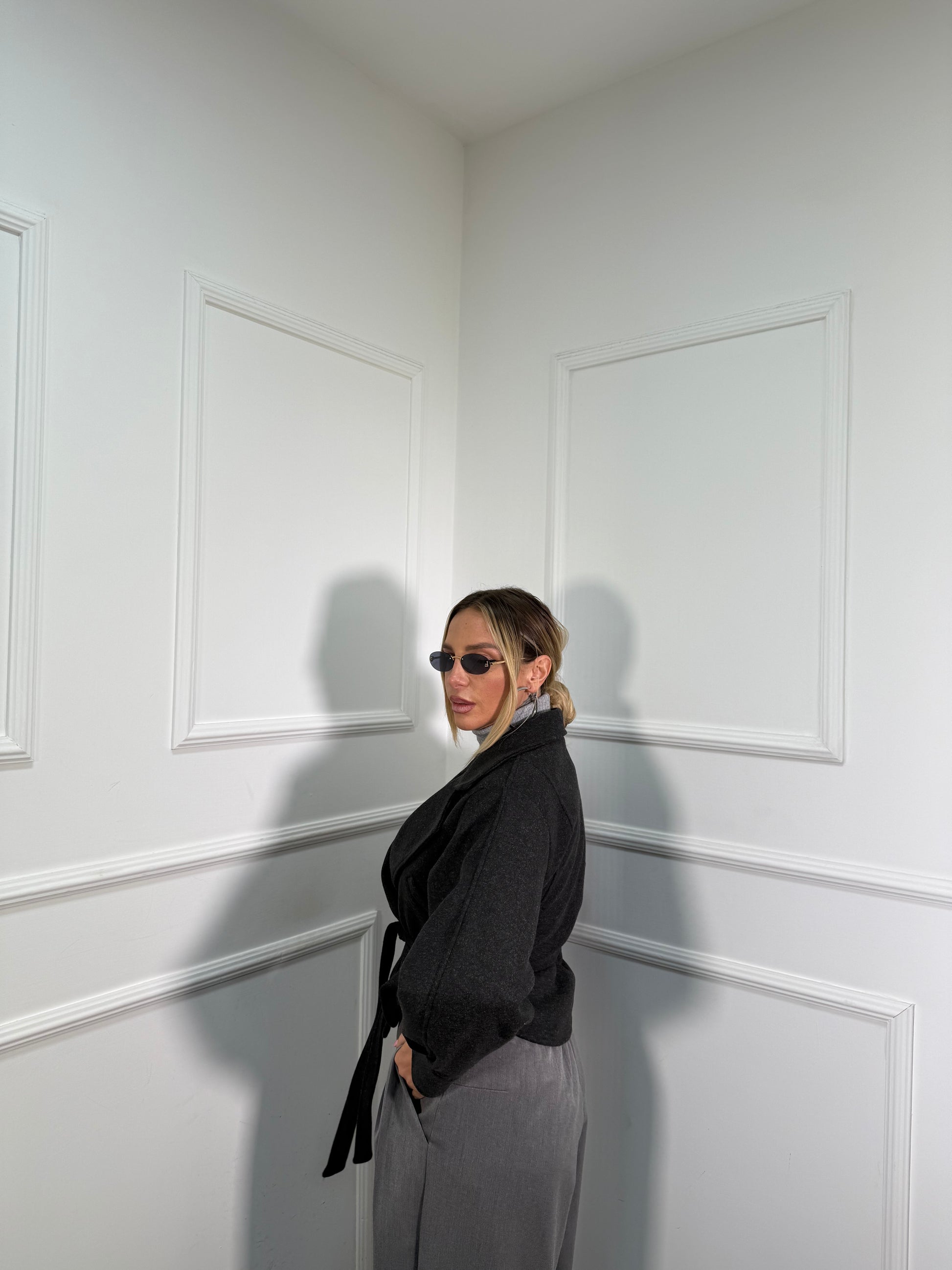 Trench crop in panno con spalline e fusciacca regolabile, foderato